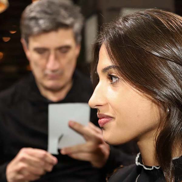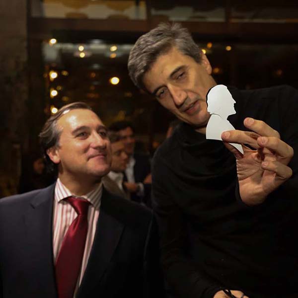 Während der Feier, sei es bei der Cocktailparty, dem Bankett oder der Party, stelle ich mich in einer festen Ecke auf oder bewege mich zwischen den Gästen und schneide Porträts auf schwarzem Papier aus. Jeder nimmt seine Silhouette auf einer Karte mit, als persönliches Andenken an diesen Tag.