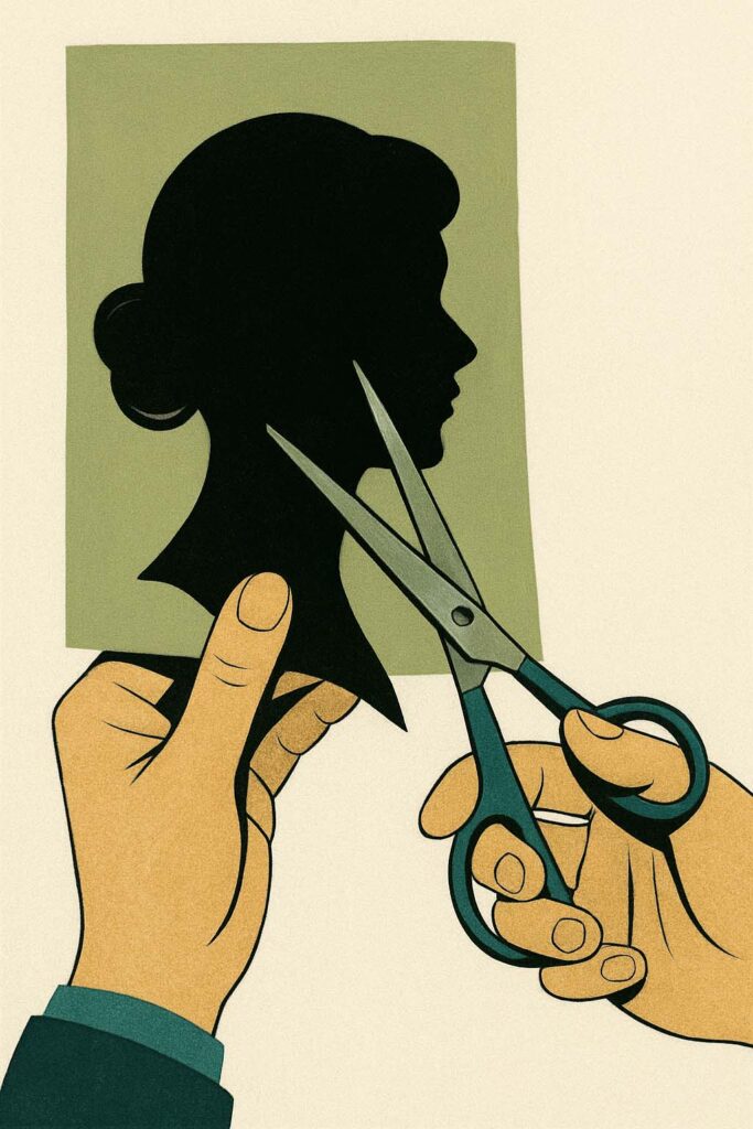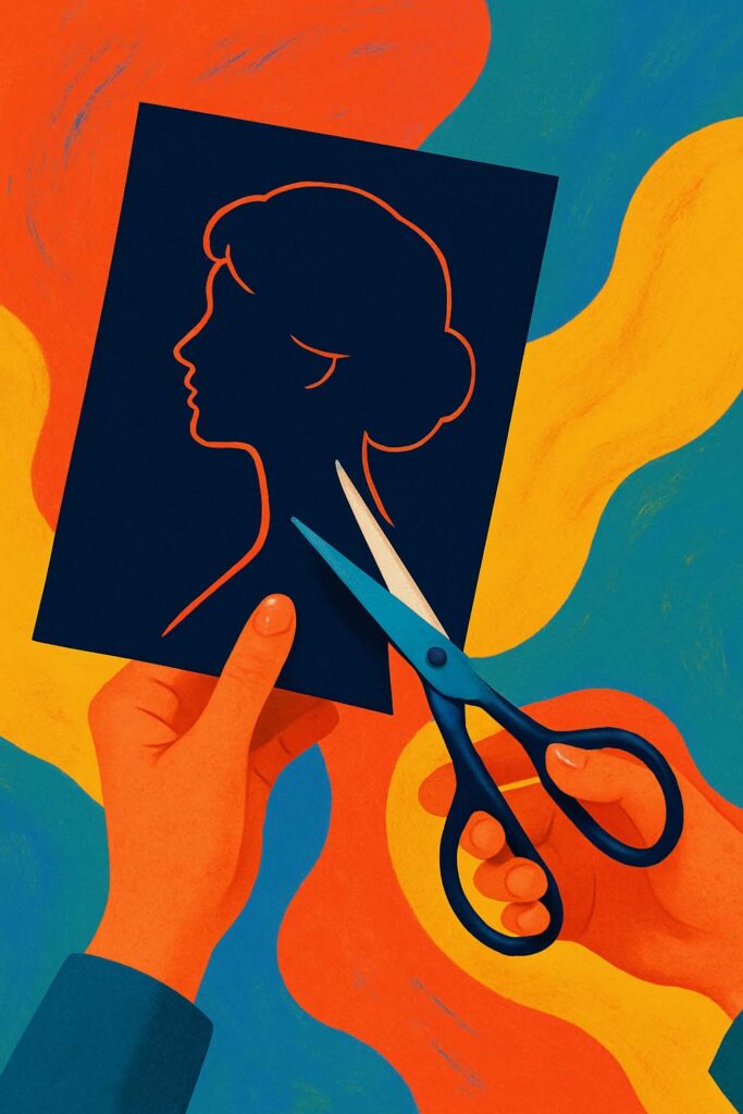 IHR MIT EINER SCHERE AUSGESCHNITTENES PORTRÄT MIT EINEM STARKEN KONTERFEI